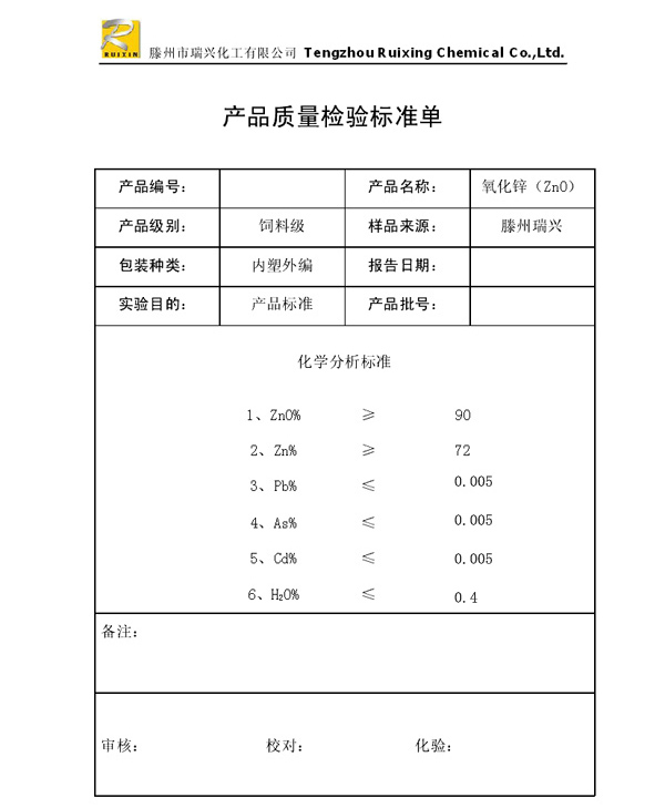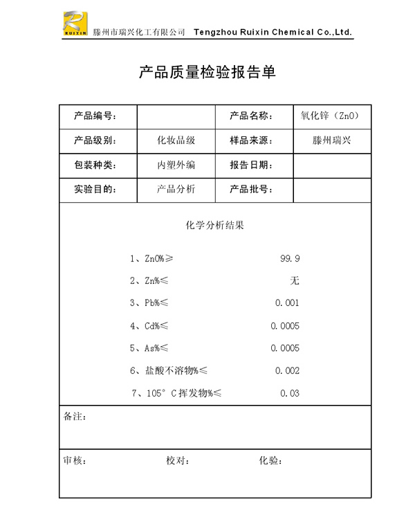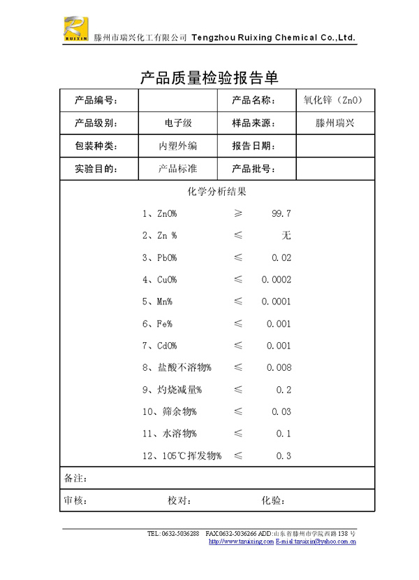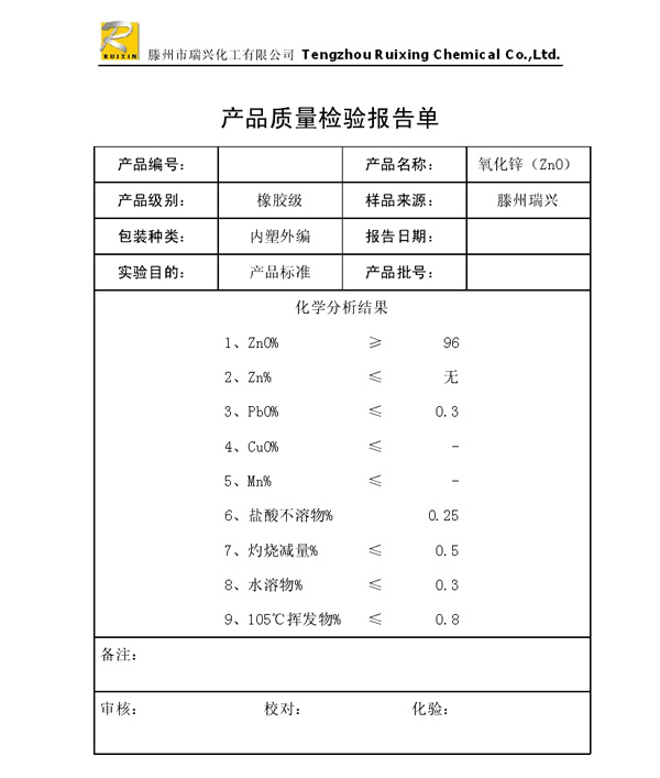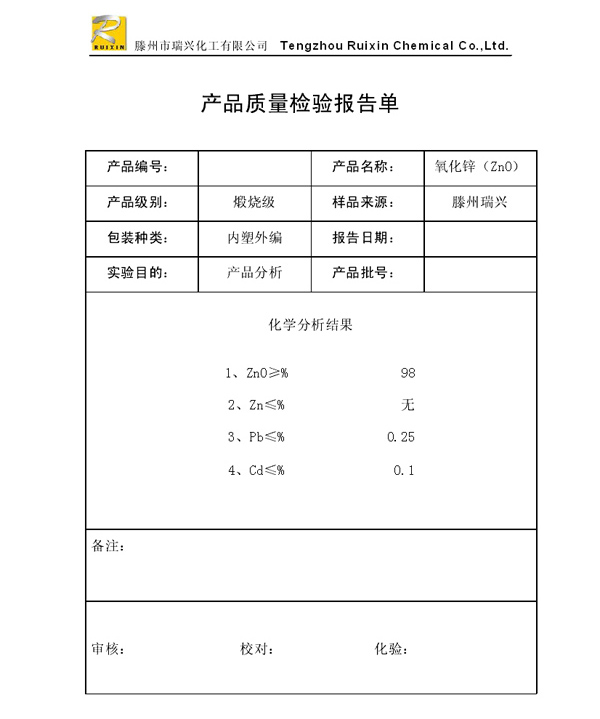 瑞興化工有限公司是生產(chǎn)氧化鋅的重點(diǎn)企業(yè),于2008年通過ISO9001:2008質(zhì)量管理體系認(rèn)證。“瑞興”牌氧化鋅在國內(nèi)擁有較大穩(wěn)定的市場,并遠(yuǎn)銷東南亞、中東、中南美等國家和地區(qū),在國內(nèi)外享有較高聲譽(yù)。